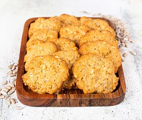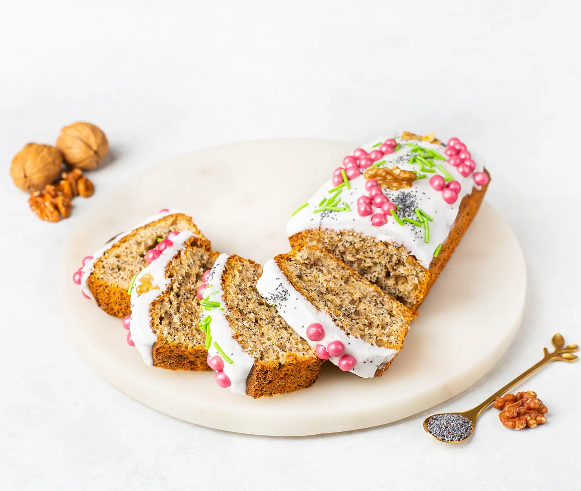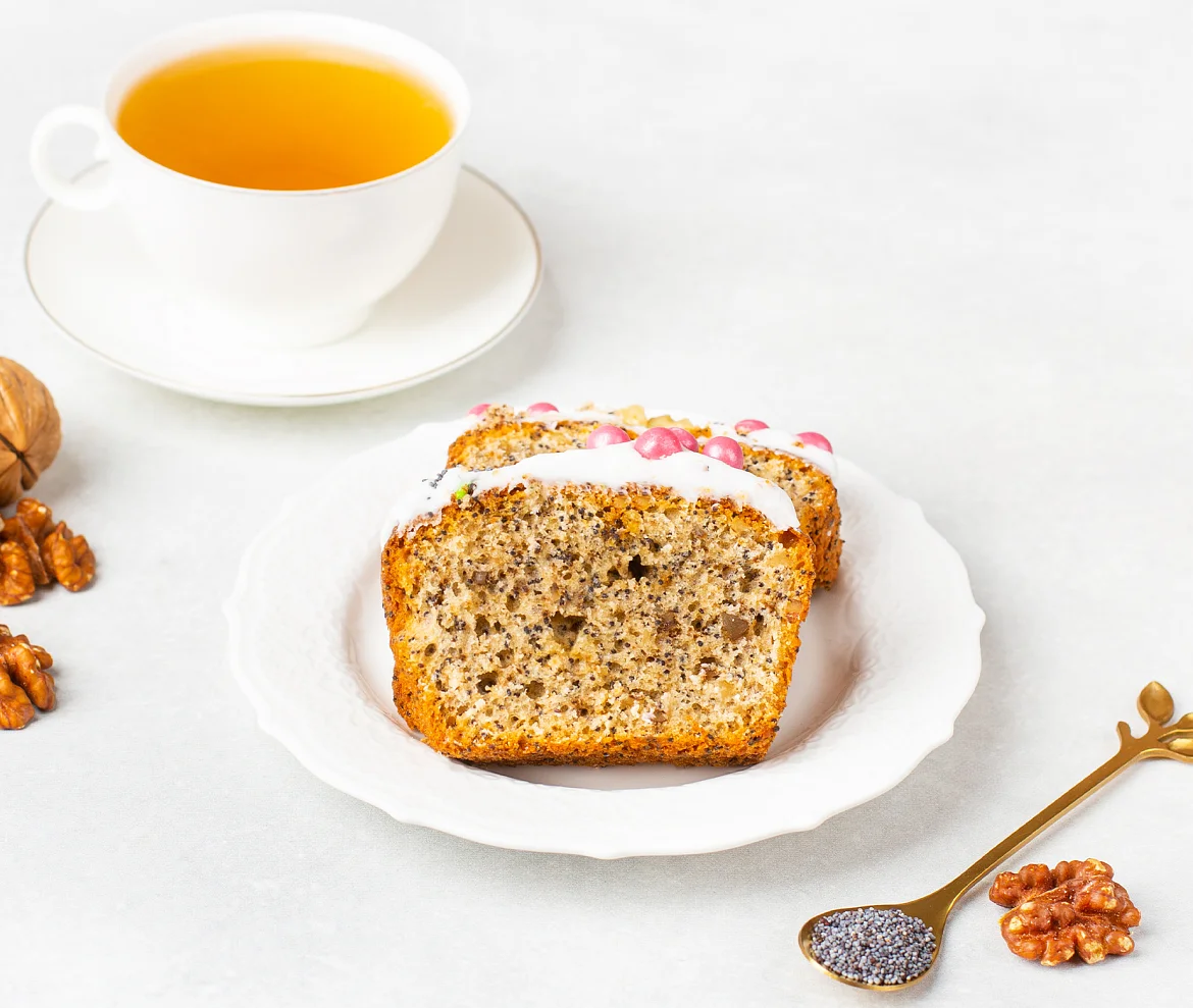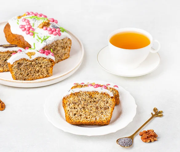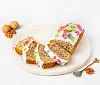 Сахар, помадка сахарная (сахар, вода очищенная, патока, эмульгатор моно- и диглицериды жирных кислот, ароматизатор экстракт ванили натуральный), яйцо куриное пищевое, мука пшеничная в/с, масло подсолнечное рафинированное дезодорированное, вода очищенная, ядро ореха грецкого (6%), мак пищевой (5%), крахмал кукурузный, крахмал пшеничный, йогурт сухой обезжиренный (молоко сухое обезжиренное, закваска), молоко цельное сухое, ароматизаторы, разрыхлитель сода пищевая (гидрокарбонат натрия), соль, краситель натуральный бета-каротин. Произведено на предприятии, на котором также выпускаются продукты, содержащие арахис, кунжут, сою. ПРИ ПРОИЗВОДСТВЕ ИСПОЛЬЗУЮТСЯ ГРЕЦКИЕ ОРЕХИ, КОТОРЫЕ ПРОШЛИ ТЩАТЕЛЬНУЮ ОБРАБОТКУ, ОДНАКО, В РЕДКИХ СЛУЧАЯХ НЕ ИСКЛЮЧЕНО ПОПАДАНИЕ СКОРЛУПЫ И (ИЛИ) ЕЁ ФРАГМЕНТОВ.