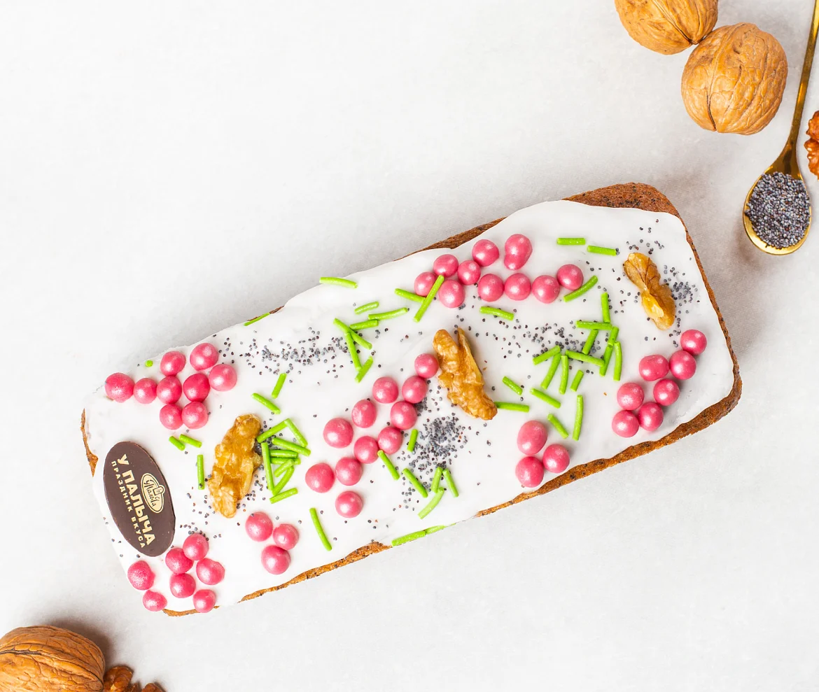 Воздушное сдобное тесто приготовленное исключительно из натуральных продуктов: отборные яйца, натуральный йогурт, ароматный мак и дроблённый грецкий орех. Много вкуснейшей помадки от Палыча и роскошный декор из разноветных сладких бусин. И шоколадная медалька с логотипом "У Палыча" из премиального темного шоколада из отборных какао-продуктов.