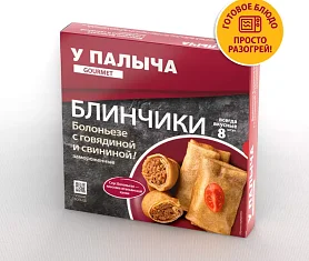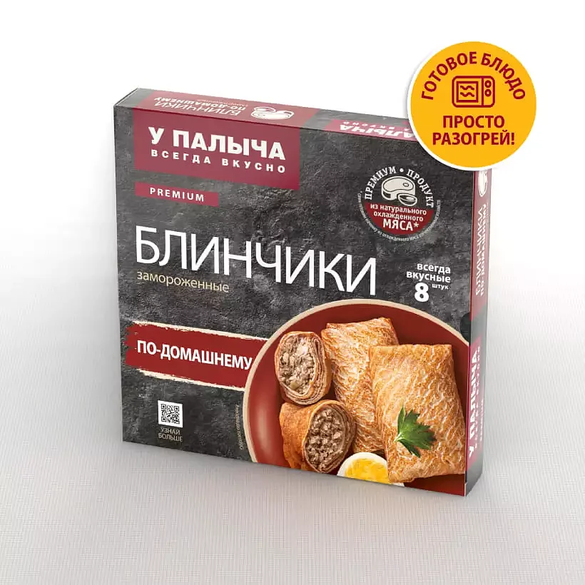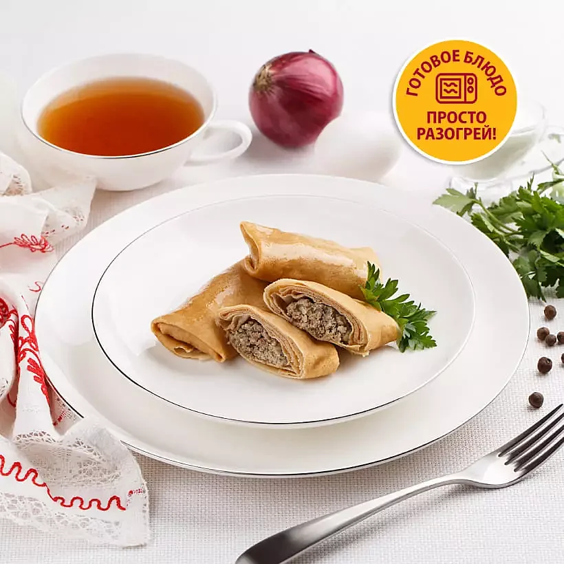Замороженное готовое блюдо! Нежные тонкие блинчики. Молодая говядина и свиная вырезка, обжаренные с лучком. Отборное куриное яйцо, свежая зелень и специи. Простой и сытный рецепт.