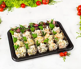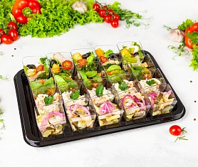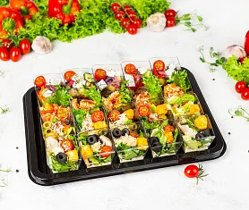 - Салаты порционные. Индивидуальные порции свежих и хрустящих салатов, идеально подходящих для обедов или легких закусок.