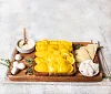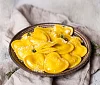 Мука из твердых сортов пшеницы в/с, сыр Маасдам (молоко пастеризованное, соль (содержит агент антислеживающий ферроцианид калия), уплотнитель хлорид кальция, консервант нитрат натрия, ферментный препарат животного происхождения лизоцим (белок куриных яиц), комплексная пищевая добавка (регулятор кислотности гидроксид натрия, краситель норбиксин), закваска молочнокислых и пропионовокислых бактерий, ферментные препараты животного происхождения: химозин, пепсин), сыр творожный (творог, сливки молочные, масло сливочное, соль, стабилизатор гуаровая камедь, консервант сорбиновая кислота), мука пшеничная в/с, сыр Моцарелла для равиоли (творог, вода очищенная, масло сливочное, молочный белок, сухое обезжиренное молоко, регуляторы кислотности: цитрат натрия, лимонная кислота; соль), вода очищенная, сыр Пармезан (молоко нормализованное пастеризованное, соль (содержит агент антислеживающий ферроцианид калия), уплотнитель хлорид кальция, молокосвертывающий ферментный препарат животного происхождения, ферментный препарат животного происхождения липаза, консервант нитрат натрия, ферментный препарат лизоцим (белок куриных яиц), бактериальная закваска молочнокислых мезофильных и термофильных микроорганизмов, краситель аннато (содержит регулятор кислотности гидроксид натрия)), яйцо куриное пищевое, крахмал кукурузный, соль, краситель натуральный бета-каротин. Произведено на предприятии, на котором также выпускаются продукты, содержащие арахис, горчицу, кунжут, моллюски, орехи, рыбу, сельдерей, сою.