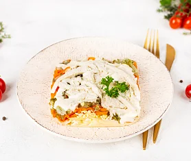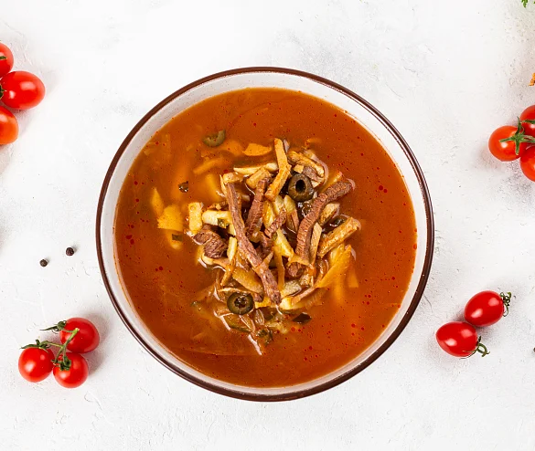 Бульон говяжий (вода очищенная, говядина, морковь столовая свежая, лук репчатый свежий), картофель свежий, огурцы маринованные (огурцы, вода, сахар, соль, регулятор кислотности уксусная кислота, зелень укропа, лук), филе грудки куриное б/к, вода очищенная, морковь столовая свежая, томатная паста, лук репчатый свежий, масло подсолнечное рафинированное дезодорированное, зелень петрушки свежая, крупа перловая, соль, перец черный молотый, лавровый лист.